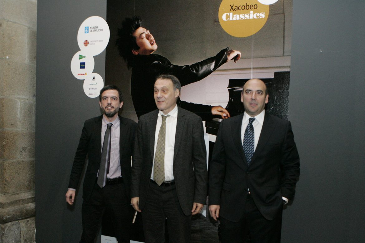 El conselleiro de Cultura e Turismo, Roberto Varela, y el director-xerente de la S.A. Xestión do Plan Xacobeo, Ignacio Santos, junto con el director artístico del Xacobeo Classics, César Wonenburger, presentaron esta mañana en la antigua iglesia de la Universidade de Santiago el ciclo anual de música clásica denominado Xacobeo Classics, en el que participarán artistas de primer nivel mundial, como la mezzosoprano Cecilia Bartoli, el pianista Lang Lang o la violinista Anne-Sophie Mutter.