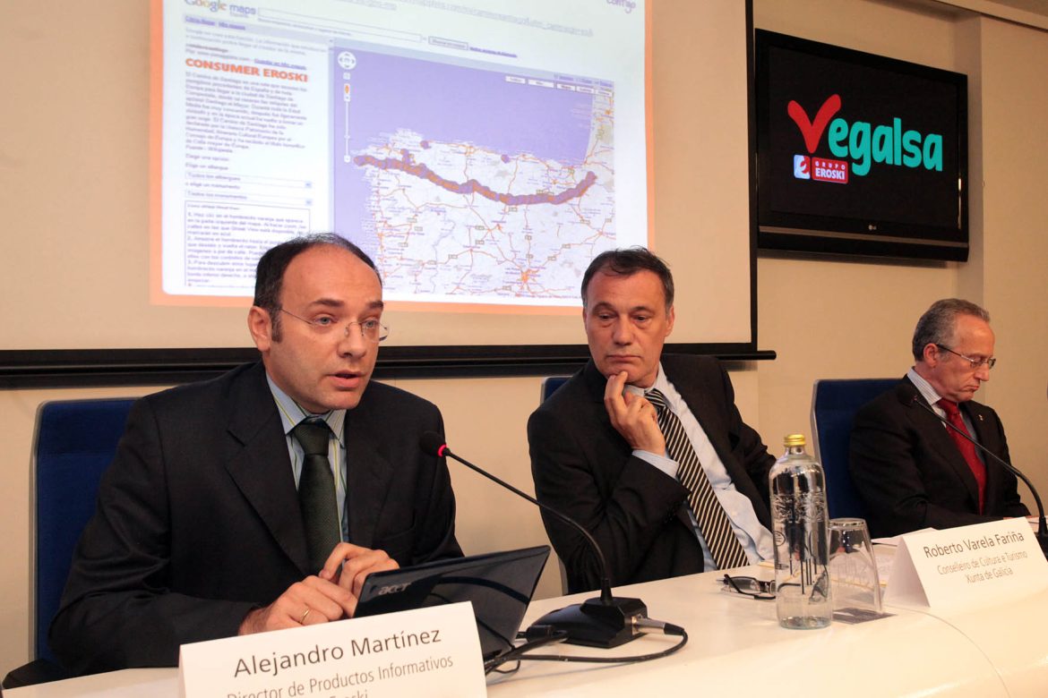 La Fundación Eroski ha presentado en Compostela su Guía del Camino de Santigao, la más visitada de internet con un registro de dos millones de visitas. El director de productos informativos de la cooperativa vasca, Alejandor Martínez, fue el encargado de hacer públicas las novedades del sitio web con motivo del convenio de patrocinio firmado entre Vegalsa-Eroski y la S.A. de Xestión do Plan Xacobeo, según el cual la empresa gallega de distribución alimentaria aportará 400.000 euros para la difusión y promoción del Xacobeo 2010. Además, la compañía difundirá el logotipo del Xacobeo en campañas promocionales por un importe superior a seis millones de euros, según informó su director general, Joaquín González Iglesias.