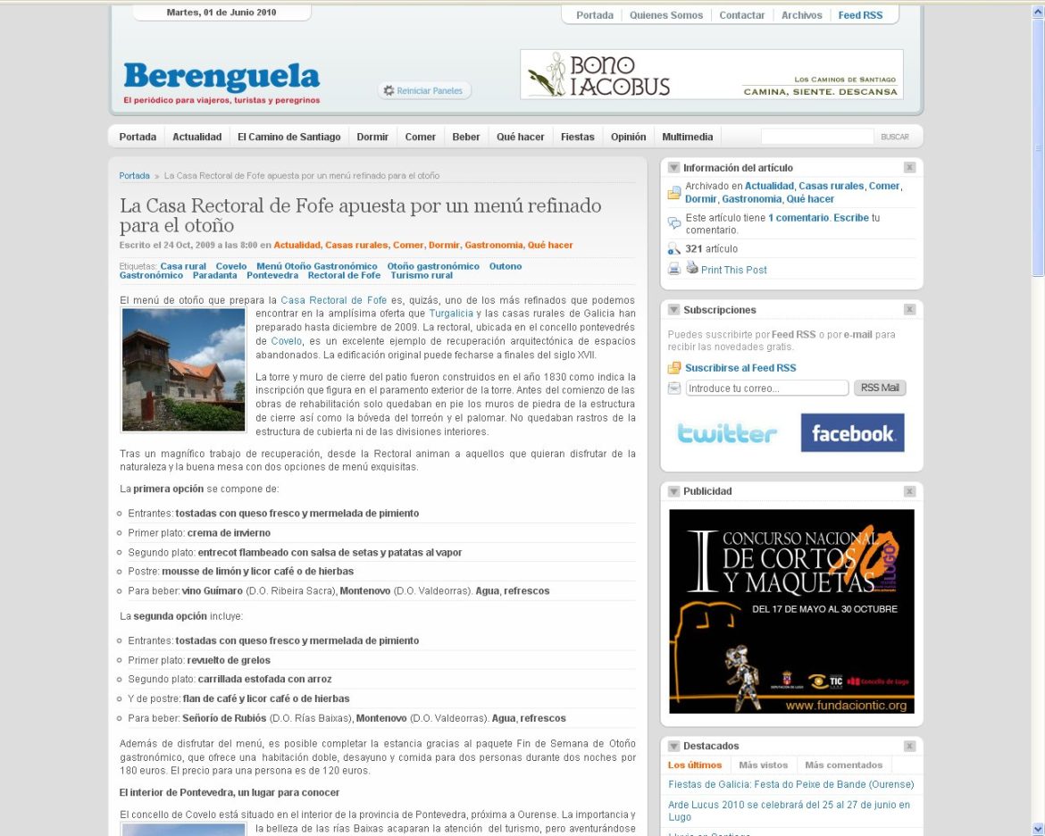 El periódico digital berenguela.com, destinado a viajeros, turistas y peregrinos, ha conseguido en el primer año de existencia situarse entre las cien páginas web más visitadas de Galicia. Sus noticias, relacionadas con el turismo en general, vienen despertando el interés de cientos de miles de lectores de 109 países diferentes. En el primer año de vida, Berenguela.com ha conseguido superar el medio millón de páginas vistas. En este periódico digital, las informaciones relacionadas con los diferentes caminos de Santiago comparten albergue con las de turismo gastronómico o cultural, con los reportajes sobre qué hacer o con las que se preocupan de dónde pasar un fin de semana.