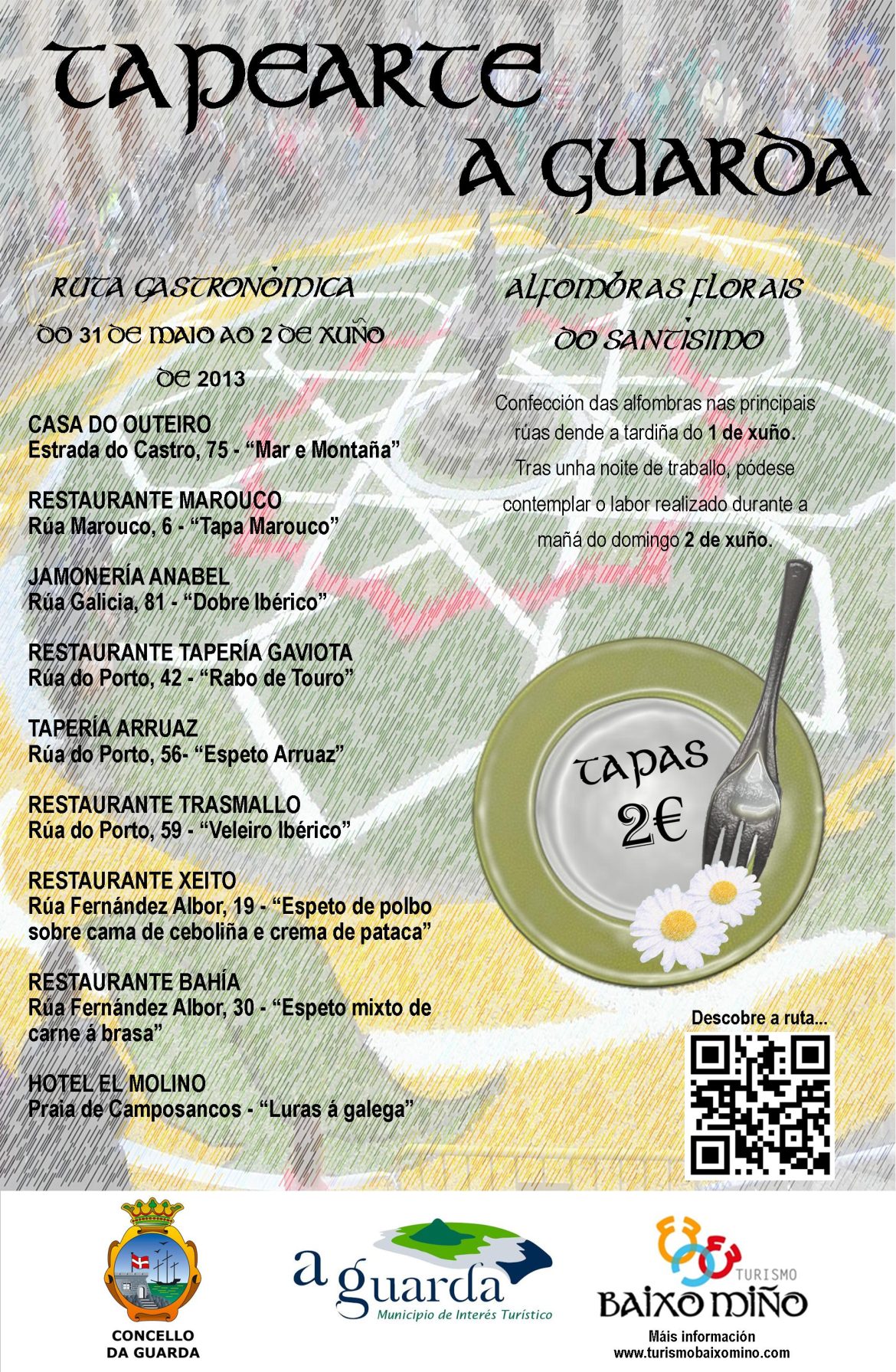 A Guarda acogerá la ruta “Tapearte” este fin de semana, organizada por la Asociación de Empresarios y Profesionales Turismo Baixo Miño. En el recorrido gastronómico participarán nueve establecimientos hosteleros de la localidad pontevedresa y se podrán degustar numerosas tapas por tan sólo 2 euros cada una.