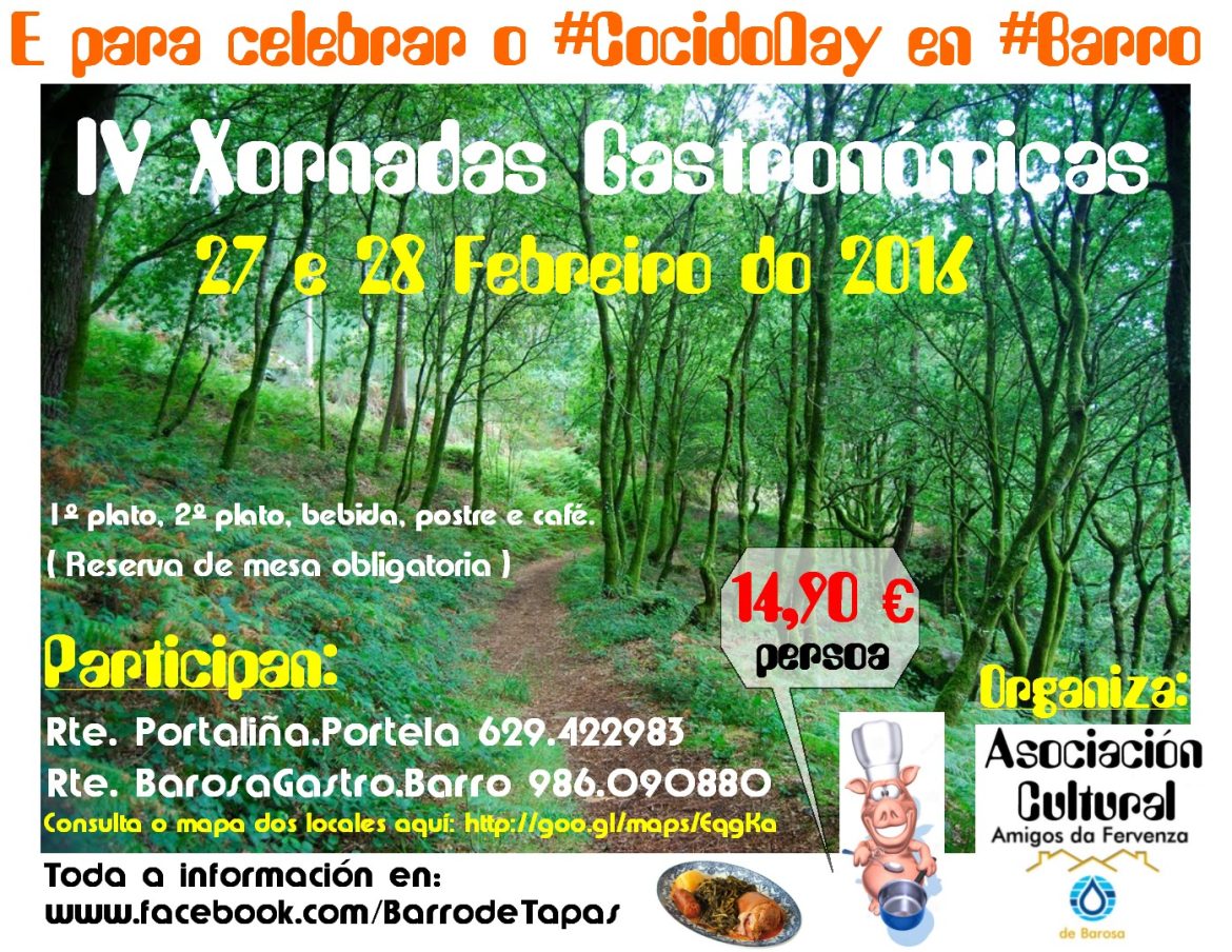 La Asociación Cultural “Amigos da Fervenza da Barosa” en colaboración con el Restaurante Portaliña, situado en el Lg. de Barbeita 6B, Portela, N-550 de Pontevedra-Santiago y el Restaurante BarosaGastro, situado en el Parque da Natureza de Barosa, Barro, han organizado durante el fin de semana del 27 y 28 de Febrero de 2016 las “IV Xornadas Gastronómicas do Cocido”. Ambos locales hosteleros se sumarán a la iniciativa del #CocidoDay y tanto el primero como el segundo plato tendrán como elemento principal de la elaboración el cocido.